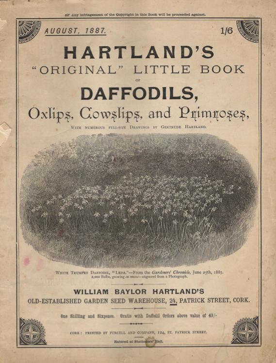 William was a savvy salesman. He boasted that he was taking on the Dutch bulb industry and described his bulb farm as “Haarlem in South Cork”[1]. In 1884 he commissioned his talented niece to draw the daffodils and other bulbs he sold. He paid £150 to W. J. Welch of London – who worked on the Gardeners’ Chronicle – to turn her stunning drawings into engravings. He then published a 32-page catalogue, Hartland’s “original” little book of Daffodils, Oxlips, Cowslips, and Primroses – with numerous full-size drawings by Gertrude Hartland.