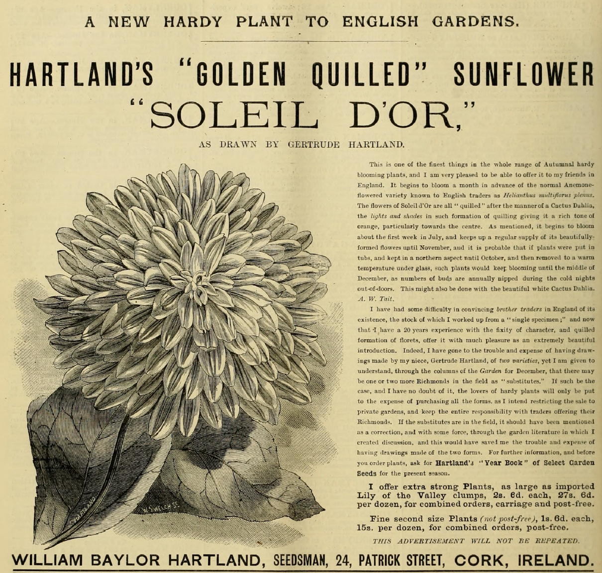 Hartland no doubt sent the editor of the Gardeners’ Chronicle a copy. It reproduced Gertrude’s picture of the daffodil, Árd-Righ, in March 1887. Other images she produced appeared in The Garden. And, of course, he took out adverts. The coverage he generated in the gardening press meant soon gardeners in England were clamouring for his bulbs.